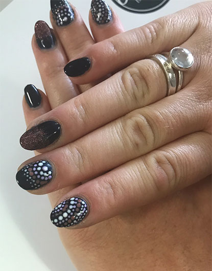 Hard wearing gel nails applied to the natural nail with nail art and/or glitter